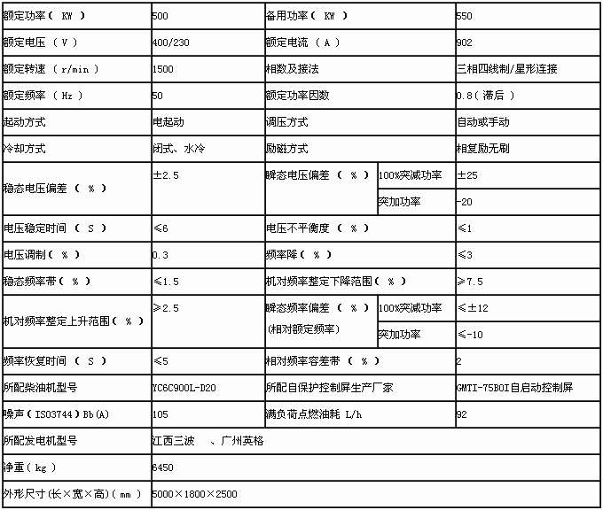 500KW柴油發(fā)電機(jī)組主要技術(shù)參數(shù)